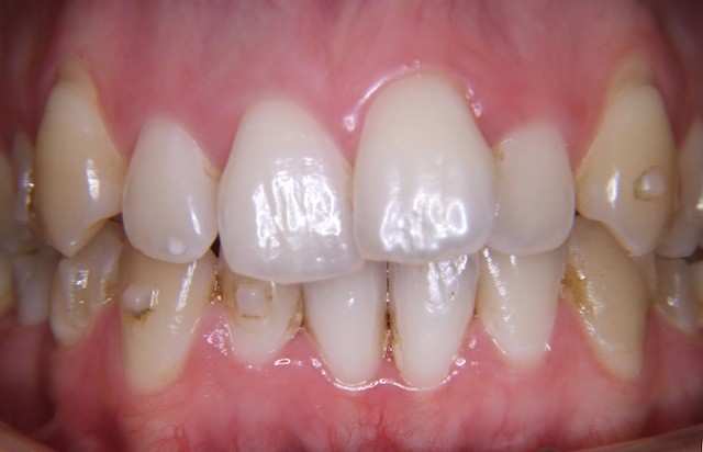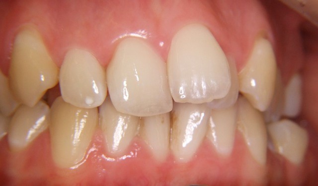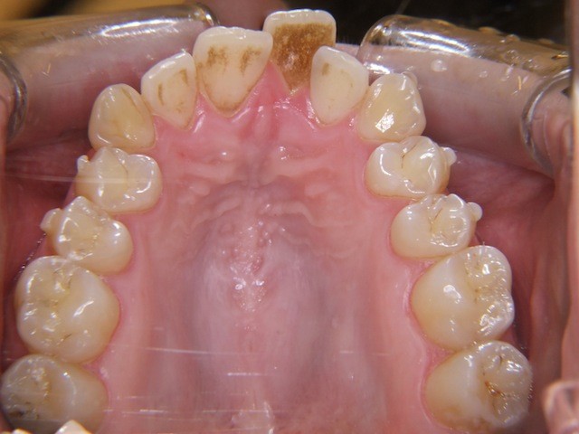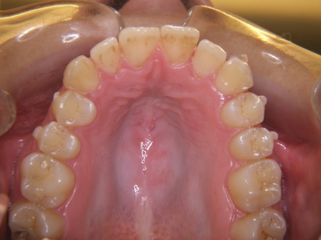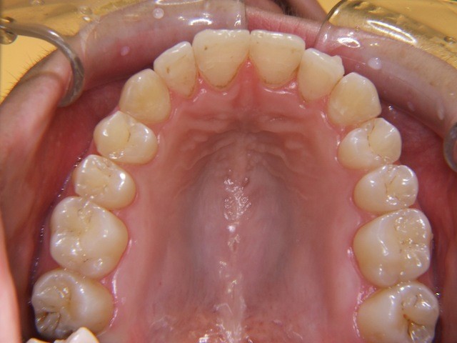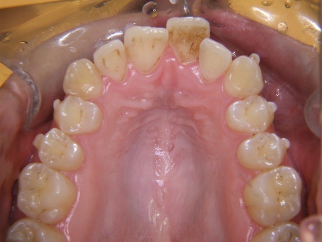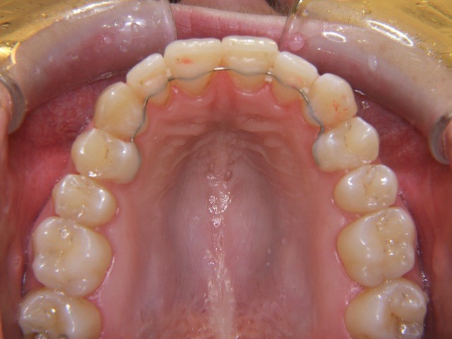 Bilderserie Invisalignbehandlung Oberkiefer mit Stabilisierungsdraht am Schluss. Man beachte die Ansammlung von Belägen und Verfärbungen infolge Nischenbildung am Zahn der am meisten im Engstand steht.